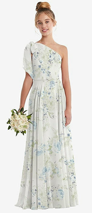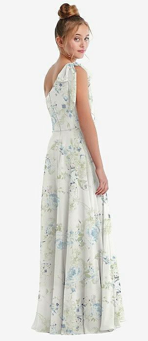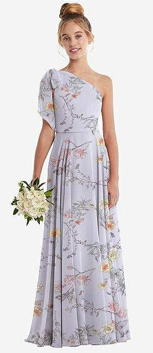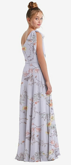 One-Shoulder Scarf Bow Chiffon Junior Bridesmaid Dress in butterfly botanica silver dove