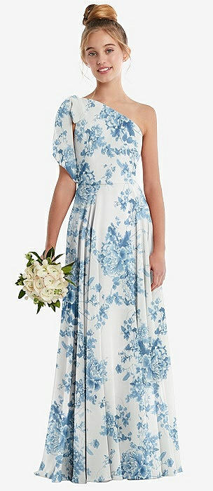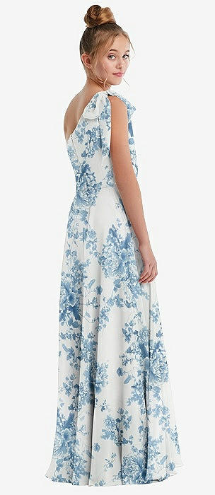 One-Shoulder Scarf Bow Chiffon Junior Bridesmaid Dress in coquette floral print