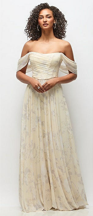 Off-the-Shoulder Basque Corset Floral Chiffon Maxi Dress in butterfly botanica silver dove