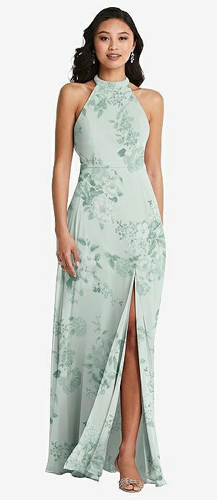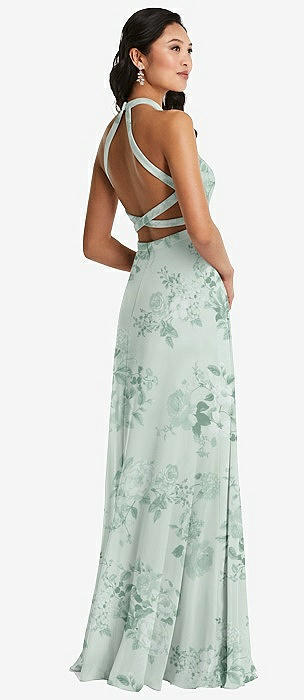 Stand Collar Halter Maxi Dress with Criss Cross Open-Back in mint green floral