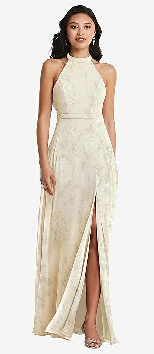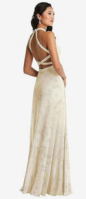 Stand Collar Halter Maxi Dress with Criss Cross Open-Back in butter yellow floral