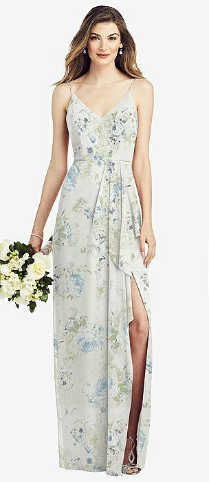 Spaghetti Strap Draped Skirt Gown with Front Slit in cottage rose dusk blue