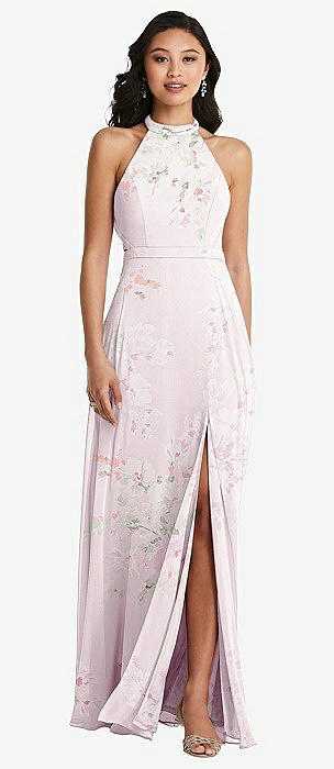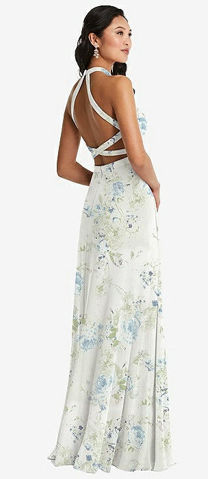Stand Collar Halter Maxi Dress with Criss Cross Open-Back in blush garden