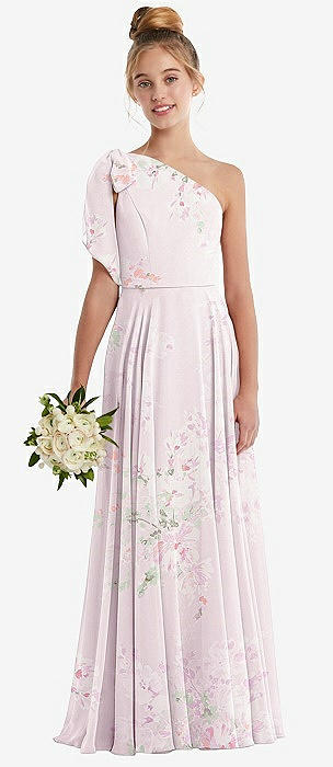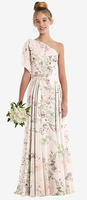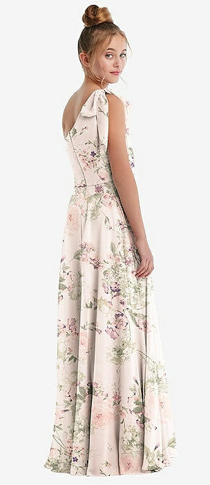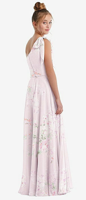 One-Shoulder Scarf Bow Chiffon Junior Bridesmaid Dress in coquette floral print