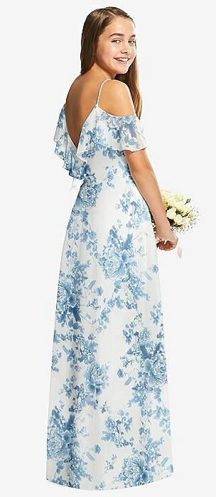 Floral Sleeveless Open-Back Satin Junior Bridesmaid Dress in porcelain blue seraphina floral