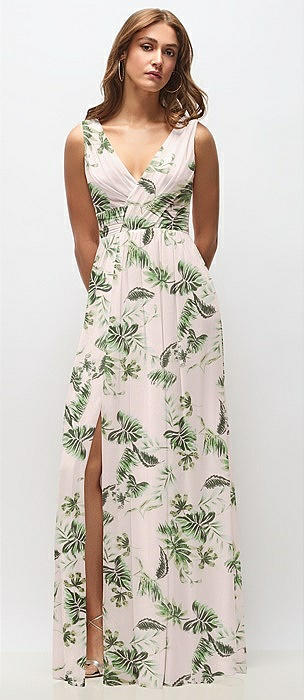 Sleeveless Draped Chiffon Maxi Dress with Front Slit in palm beach print
