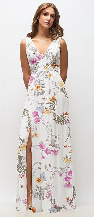 Sleeveless Draped Chiffon Maxi Dress with Front Slit in butterfly botanica ivory