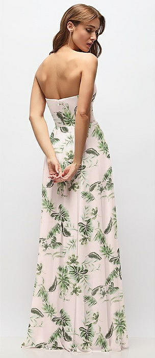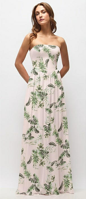Strapless Basque Drop Waist Floral Chiffon Maxi Dress with Shirred Skirt in palm beach print