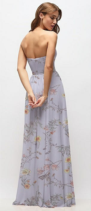 Strapless Basque Drop Waist Floral Chiffon Maxi Dress with Shirred Skirt in butterfly botanica silver dove