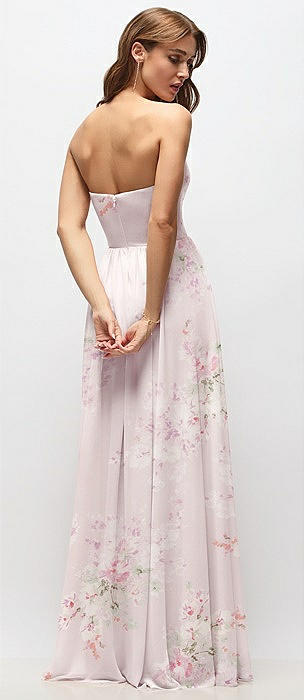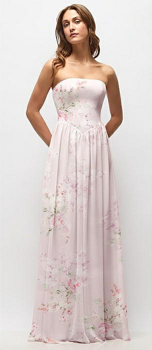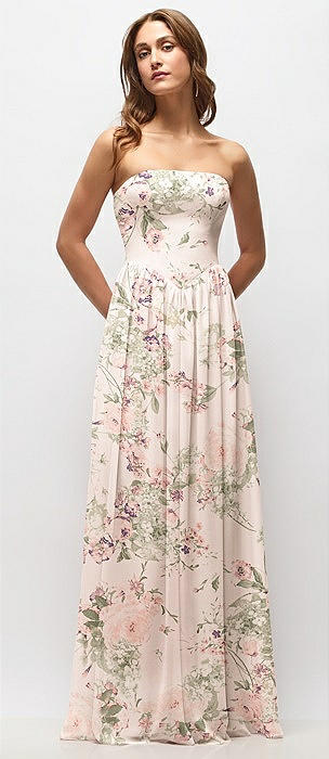Strapless Basque Drop Waist Floral Chiffon Maxi Dress with Shirred Skirt in blush garden
