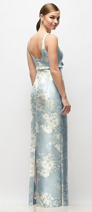 Scoop Neck Floral Satin Column Maxi Dress with Bow at Empire Waist in porcelain blue seraphina floral