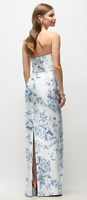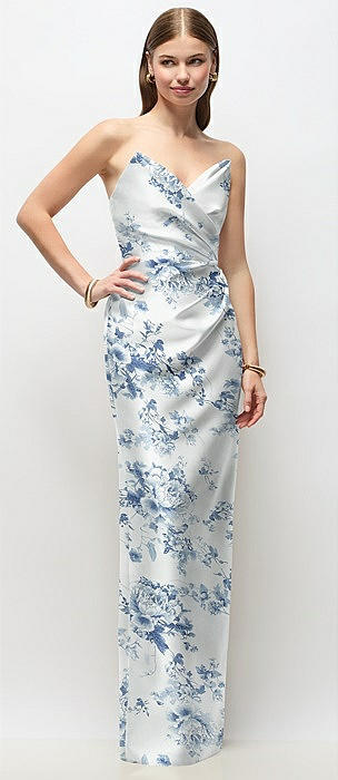 Strapless Asymmetrical Draped Satin Column Floral Maxi Dress in cottage rose larkspur