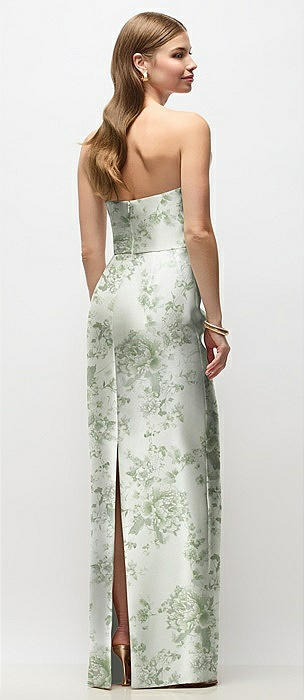 Strapless Cuff Floral Satin Midi Dress with Column Skirt & Back Bow in sage cottage rose