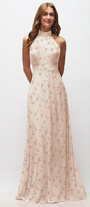High Neck Halter Backless Maxi Dress in coquette floral print