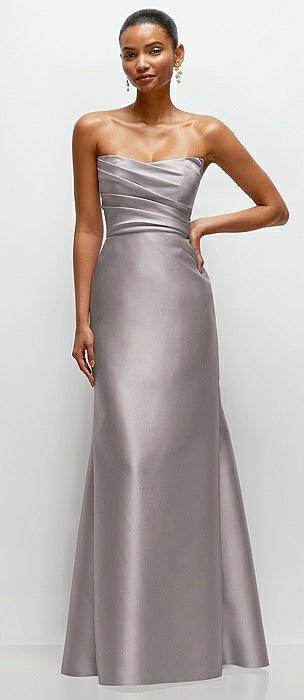 Strapless Cat-Eye Draped Bodice Satin Tumpet Dress in cashmere gray