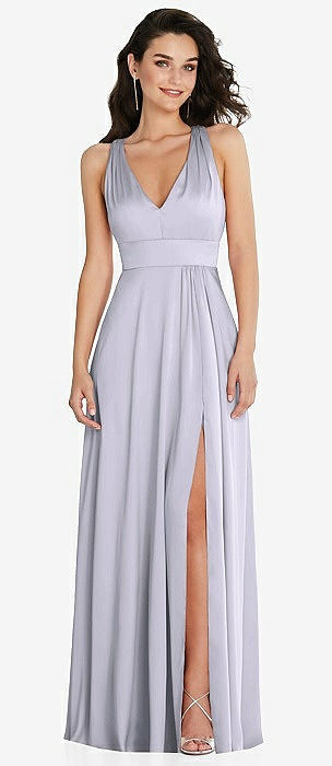Deep V-Neck Shirred Skirt Maxi Dress with Convertible Straps in silver dove