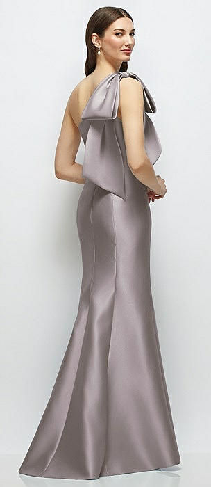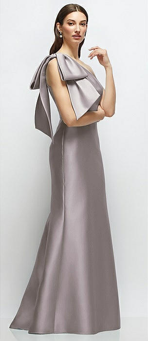 Bow One-Shoulder Satin Maxi Dress with Trumpet Skirt in cashmere gray