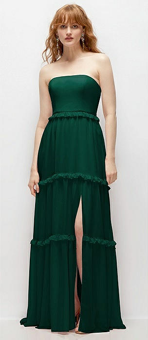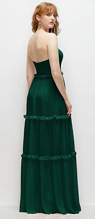 Strapless Chiffon Maxi Dress with Tiered Micro Ruffle Full Skirt in hunter green
