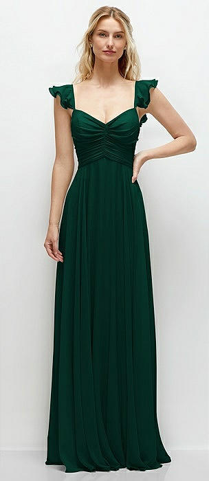 Convertible Ruffle Strap Chiffon Maxi Dress with Full Circle Skirt in hunter green