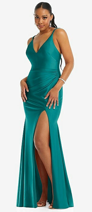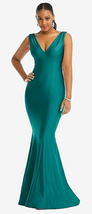 Deep V-Neck Stretch Satin Mermaid Dress with Slight Train in peacock teal