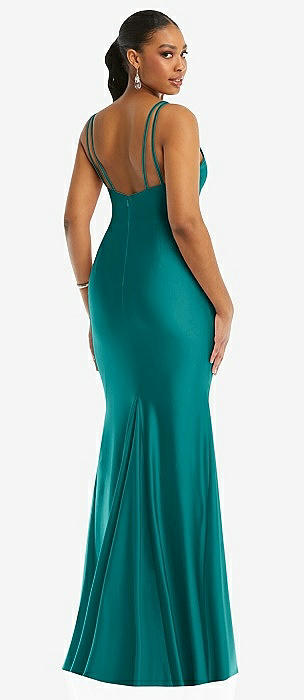 Shirred Shoulder Stretch Satin Mermaid Dress with Slight Train in peacock teal