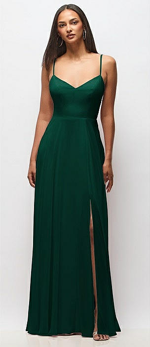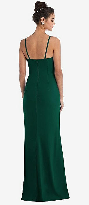 Spaghetti Strap Draped Skirt Gown with Front Slit in hunter green