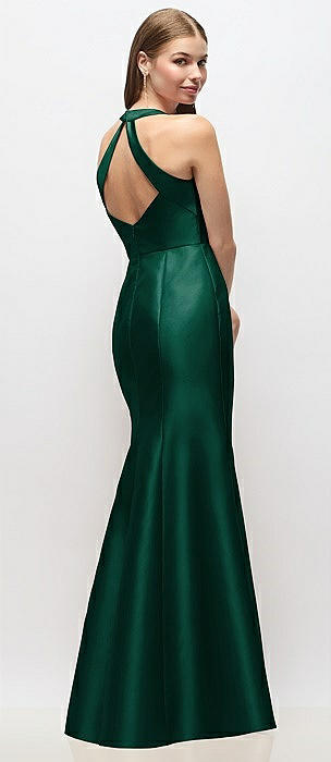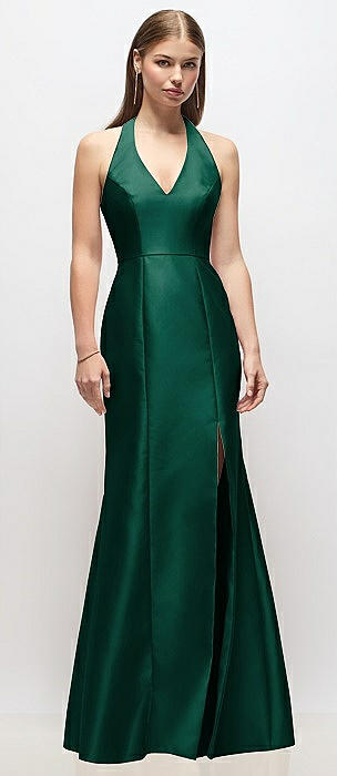 V-Neck Halter Satin Trumpet Gown in hunter green