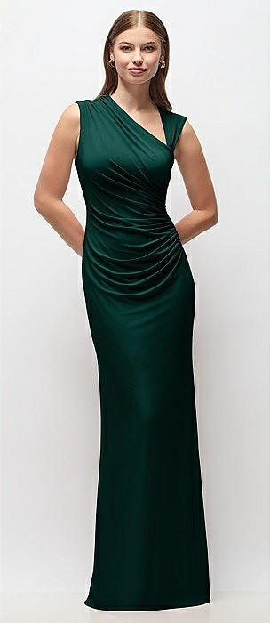 Asymmetrical Cap Sleeve Matte Jersey Column Maxi Dress with Fanned Ruching in evergreen