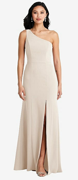 One-Shoulder Crepe Trumpet Gown with Front Slit in cameo