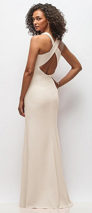 Off-the-Shoulder Criss Cross Back Trumpet Gown in oat
