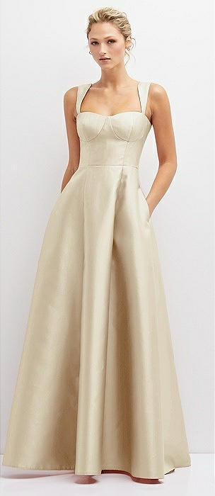 Boned Corset Closed-Back Satin Gown with Full Skirt and Pockets in champagne