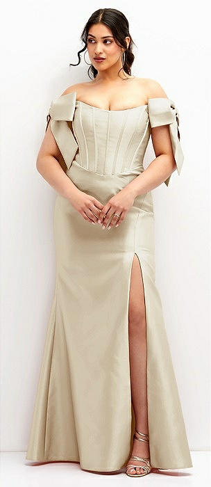 Off-the-Shoulder Bow Satin Corset Dress with Fit and Flare Skirt in champagne
