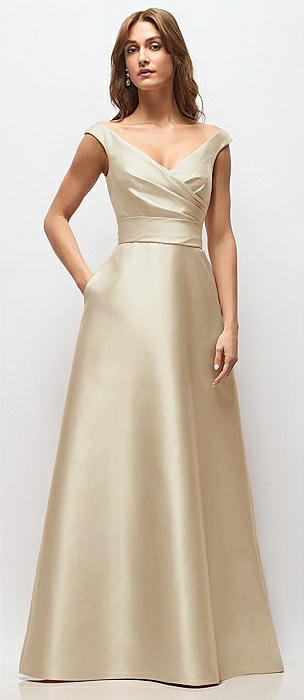 Off-the-Shoulder Draped Wrap Satin Maxi Dress in champagne