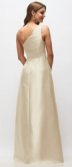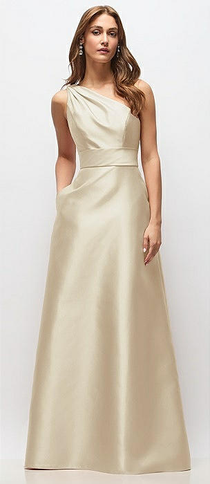 Draped One-Shoulder Satin Maxi Dress with Pockets in champagne