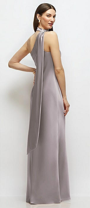 High-Neck Halter Stretch Satin Maxi Dress with Bias A-line Skirt in cashmere gray