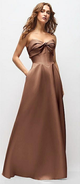 Strapless Twist Cuff Neck Satin Maxi Dress with Basque-Waist & Full Skirt in cognac