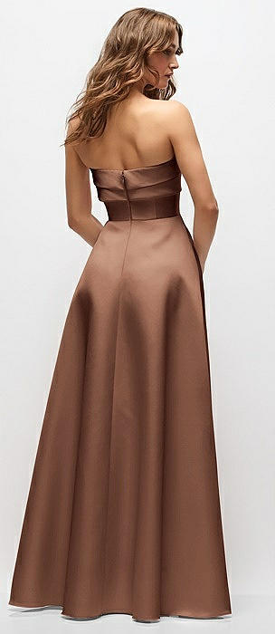 Strapless Draped Bodice Stretch Satin Column Maxi Dress in toffee