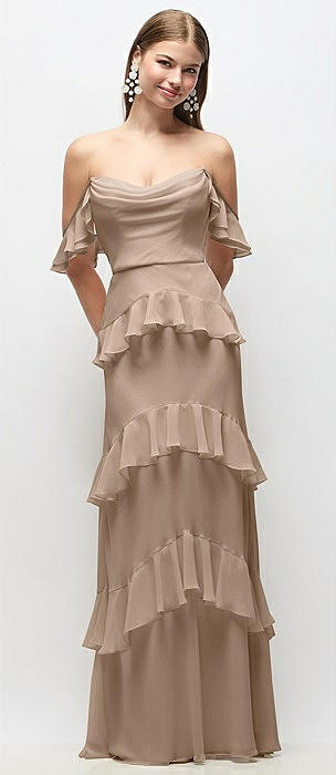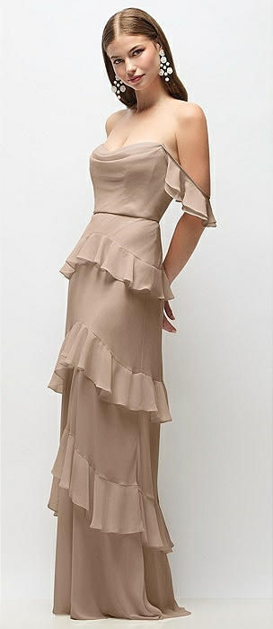 Off-the-Shoulder Cowl Chiffon Tiered Ruffle Maxi Dress with Convertible Ruffle Straps in topaz
