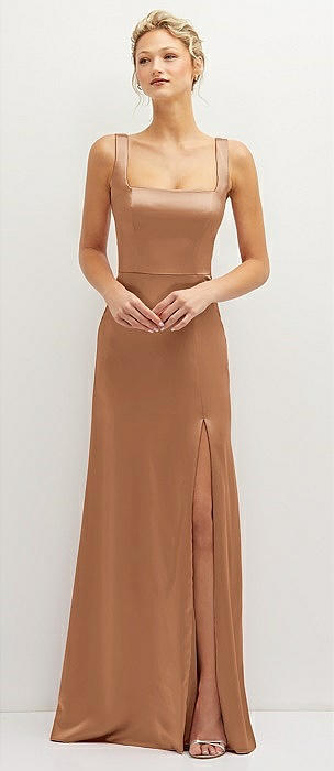 Square-Neck Satin A-line Maxi Dress with Front Slit in toffee