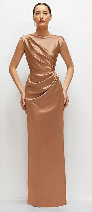 Asymmetrical Off-the-Shoulder Pleated Satin Maxi Dress in toffee