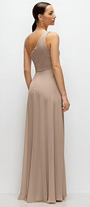One-Shoulder Bias-Cut Satin Maxi Dress with Cascading Shoulder Bow in toffee