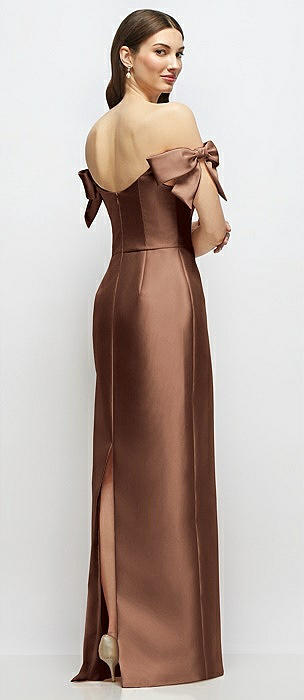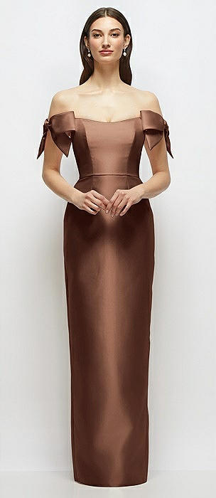 Basque-Neck Satin Column Maxi Dress with Off-the-Shoulder Bows in cognac