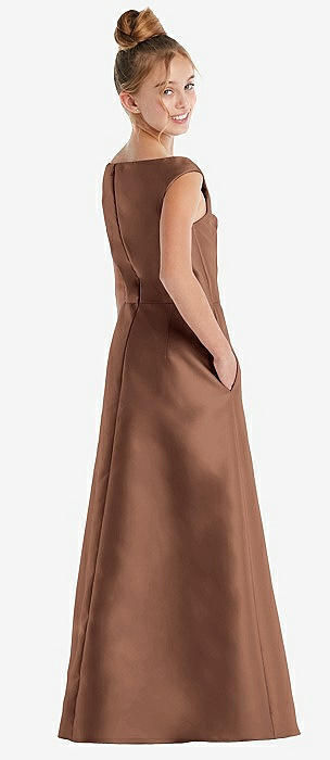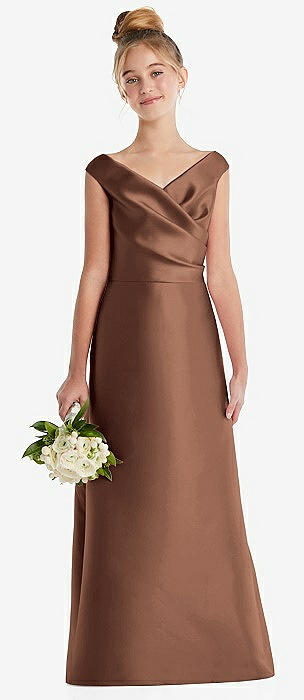 Off-the-Shoulder Draped Wrap Satin Junior Bridesmaid Dress in cognac