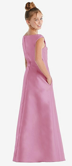 Off-the-Shoulder Draped Wrap Satin Junior Bridesmaid Dress in powder pink