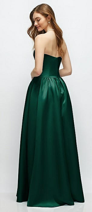 Strapless Satin Drop Waist Gown with Full Skirt in hunter green