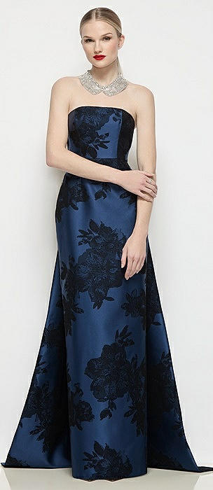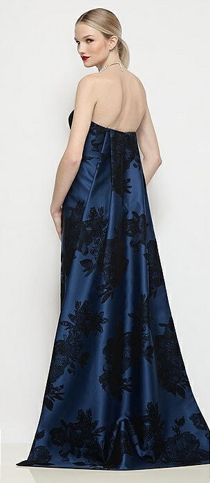 Strapless Flocked Floral Satin Column Dress with Removable Watteau Train in soft navy / black