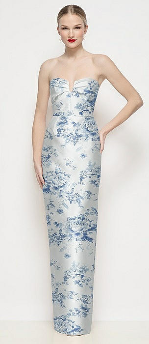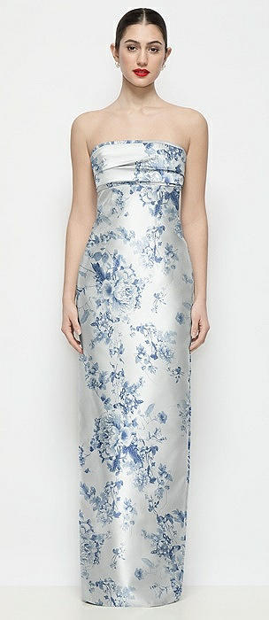 Strapless Pleated Empire Floral Satin Column Maxi Dress in cottage rose larkspur