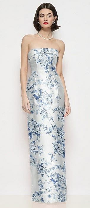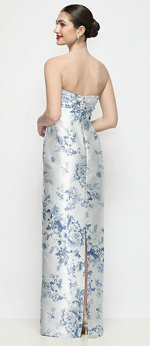 Strapless Pleated U-Wire Floral Satin Column Maxi Dress in cottage rose larkspur