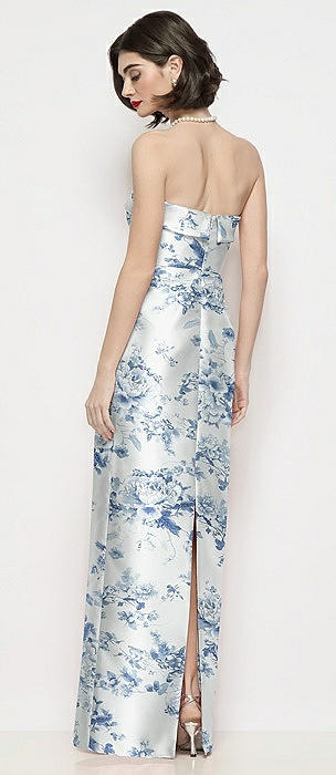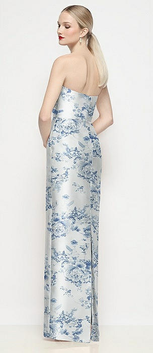 Strapless Cuff Neck Floral Satin Maxi Dress with Column Skirt in cottage rose larkspur