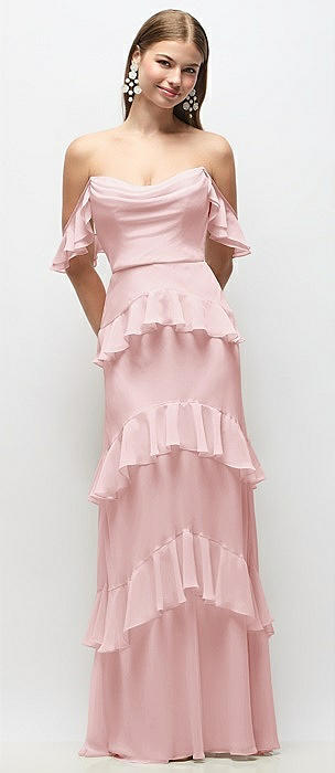 Off-the-Shoulder Cowl Chiffon Tiered Ruffle Maxi Dress with Convertible Ruffle Straps in ballet pink